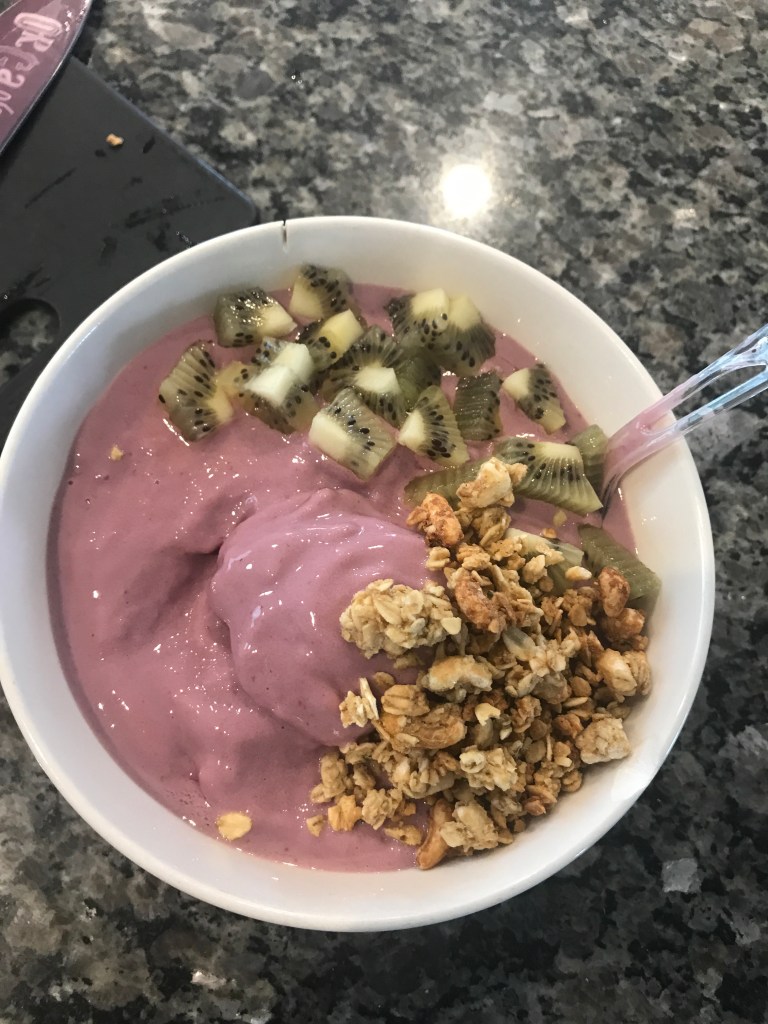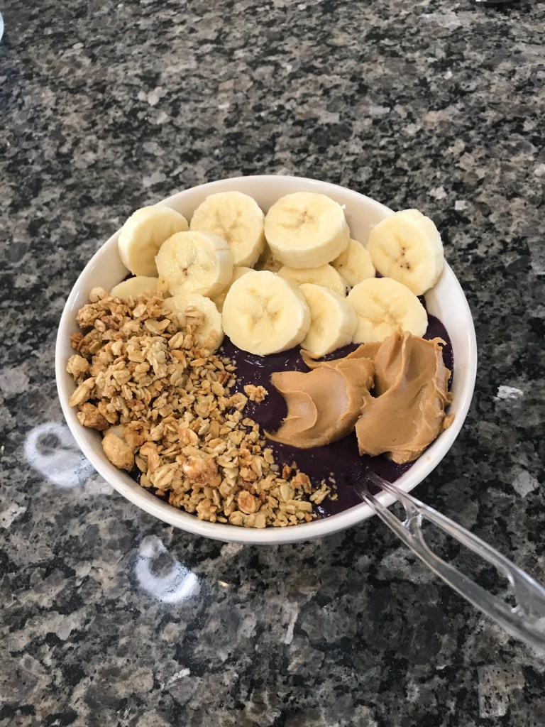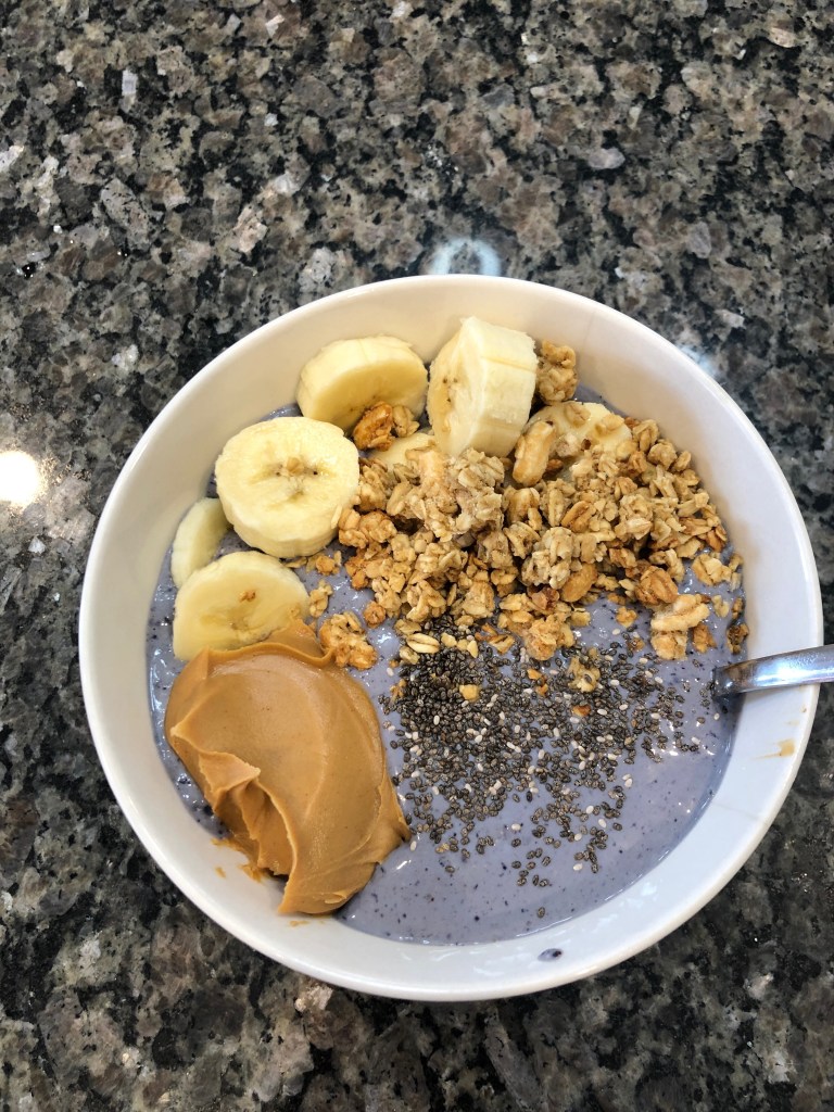 Blend in each little bit of frozen fruit at a time, or else it might get stuck! Then place in bowl and add banana, granola, and a spoonful of peanut butter and enjoy!